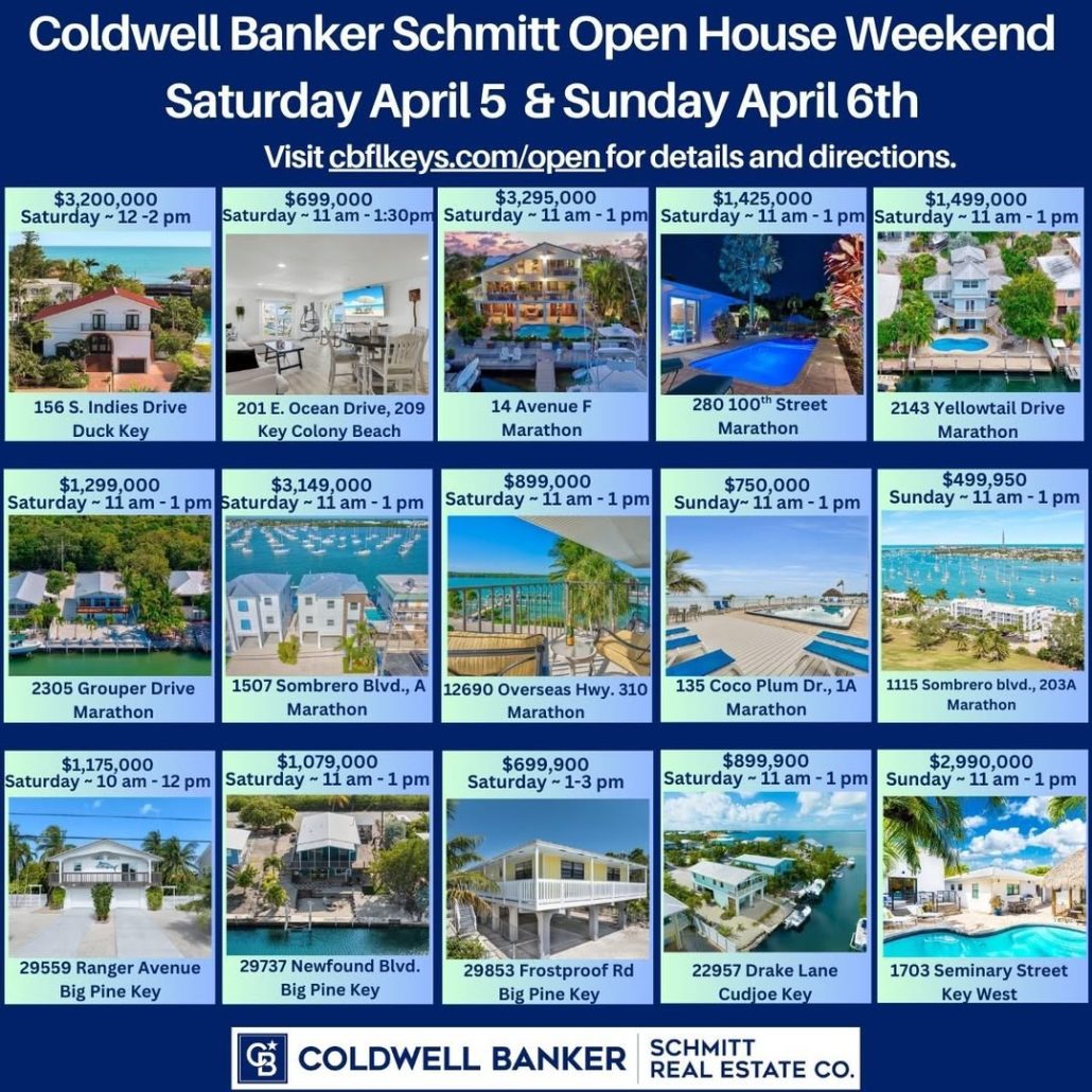 Visiting the Keys and thinking how nice it would be to have a home here? Our sister company, Coldwell Banker Schmitt, will be hosting Florida Keys Open House events between Key West and the Middle Keys this weekend, Saturday April 5 and Sunday April 6. Visit https://cbflkeys.com/open for details and directions. Find out more about the Keys residential experience. Hope to see you there! #keywest #LowerKeys #MiddleKeys #FloridaKeysRealEstate #coldwellbanker